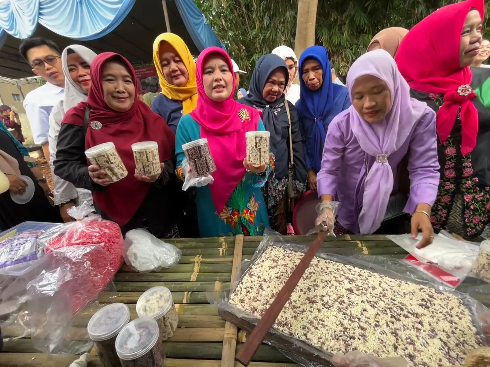 Cing Ikah turun langsung berjibaku bersama ibu-ibu membuat teng-teng. Pembuatan camilan khas Betawi itu dilakukan di dekat Alun-alun Timur Grand Depok City, Kecamatan Cilodong, Selasa (13/05/25).
