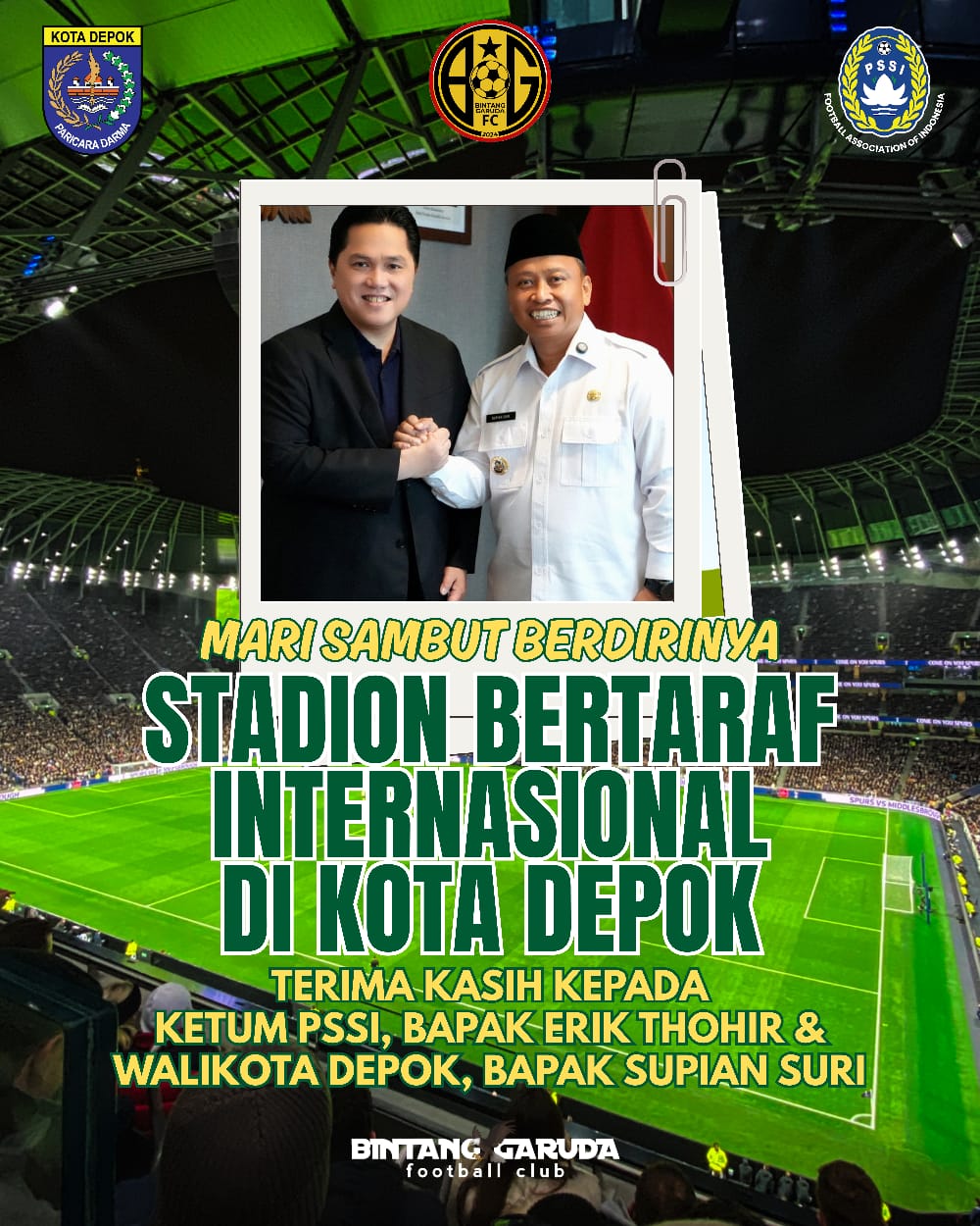 Halaman.co.id |Depok – Langkah Wali Kota Depok, Supian Suri yang merencanakan bangun Stadion Sepakbola bertaraf internasional diapresiasi banyak pihak, salah satunya klub Sepakbola Kota Depok, Bintang Garuda FC.