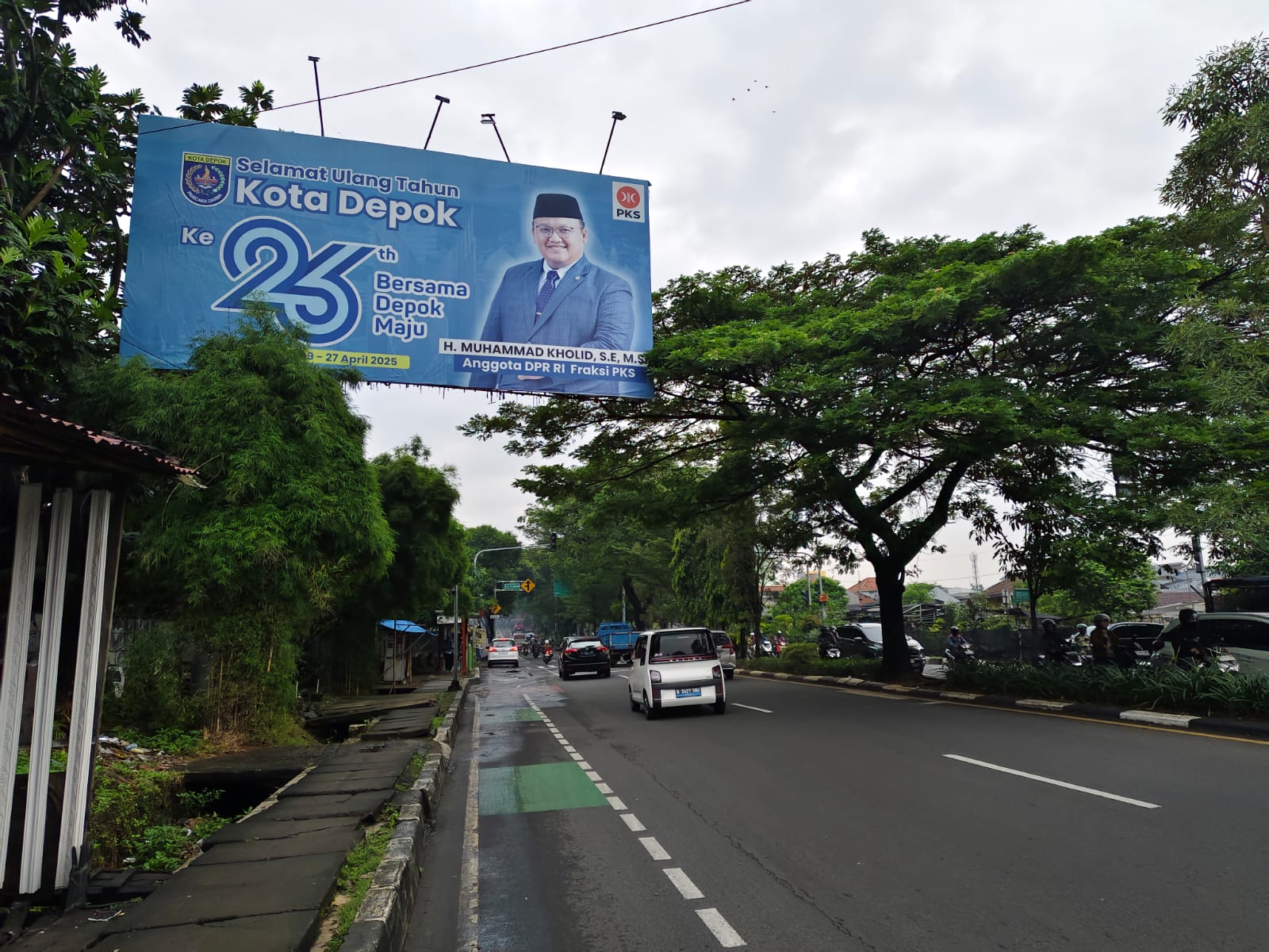 Sebuah billboard atau papan reklame yang terpasang di Jalan Ir. Juanda, Kota Depok, menjadi sorotan. Billboard tersebut menampilkan gambar anggota DPR RI dari Fraksi PKS, Muhammad Kholid, namun diduga tidak mengantongi izin resmi.