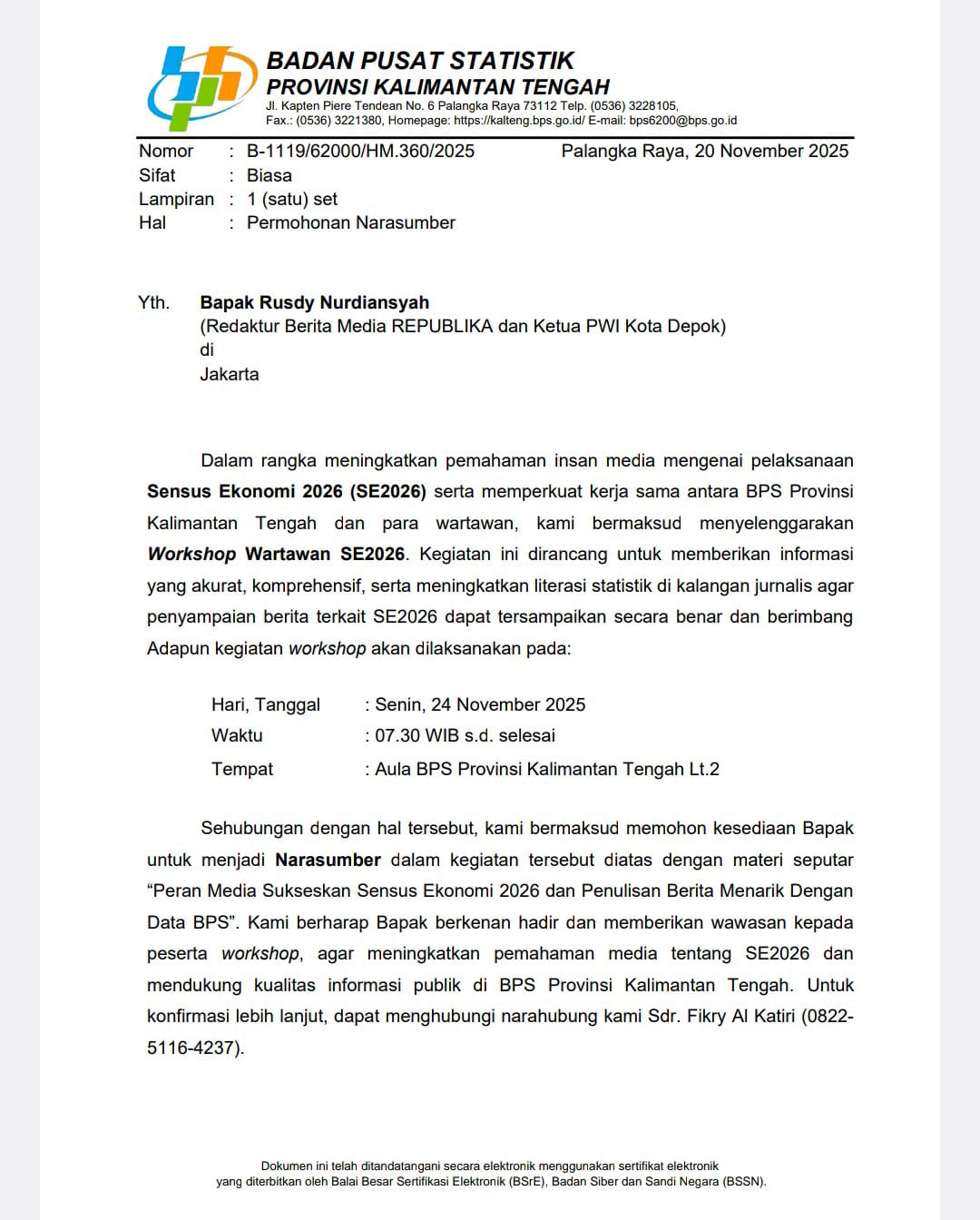 Diinformasikan, Rusdy Nurdiansyah akan menjadi pembicara pada Workshop Wartawan SE2026 yang diselenggarakan BPS Kalteng dengan tema “Peran Media Sukseskan SE2026 dan Penulisan Berita Menarik dengan Data BPS” pada Senin besok.